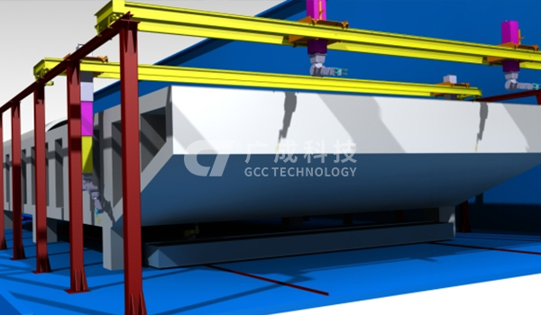 設(shè)備由龍門行走機(jī)構(gòu)、往復(fù)機(jī)構(gòu)/機(jī)器人系統(tǒng)、回收系統(tǒng)、全室除塵系統(tǒng)、工裝輸送系統(tǒng)、電控系統(tǒng)等組成