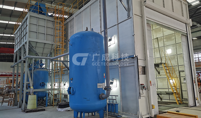 打砂房采用箱式結(jié)構(gòu),配套雙缸四槍連續(xù)加砂噴砂機(jī)、機(jī)械回收系統(tǒng)、除塵系統(tǒng)